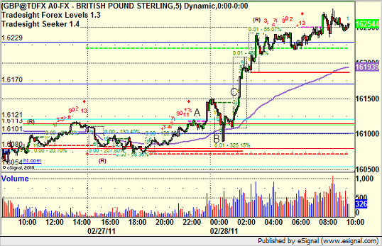 Triggered long at A after setting the trigger perfectly, and unfortunately, stopped at B on that little spike down under the Pivot, which then reversed and the trade worked great to C and beyond: