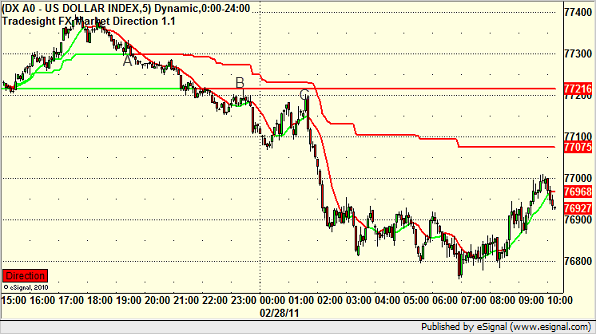 Note that the direction was up early, and then we broke to downward direction when we crossed the midpoint at A and never went back. Note also how specifically it failed at B and C, both of which would have flipped back to positive direction if it had gone above the line.
