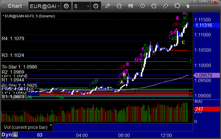 It’s very rare that the R4/S4 levels come into play on Forex pairs, but the EURUSD got there today and we were (and still are) long for it. Holding the second half almost 200 pips in the money. See that section below.