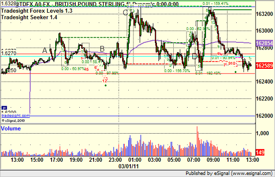 Triggered long early at A but gave you all the way until B to take the trade, never stopped, hit first target at C overnight, raised stop in the morning and stopped at D. Note the weird use of LBreak, which never cracked: