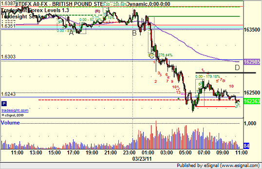 Stopped out of the last piece of the prior day’s long and then triggered short under Pivot early (half size) at A. That stopped, then we triggered short at B, might have stopped a piece of your trade, which is supposed to be a staggered exit above 20 pips plus spreads and it went 21 pips, and then hit first target at C and beyond, lowered stop and still holding final piece with stop over D: