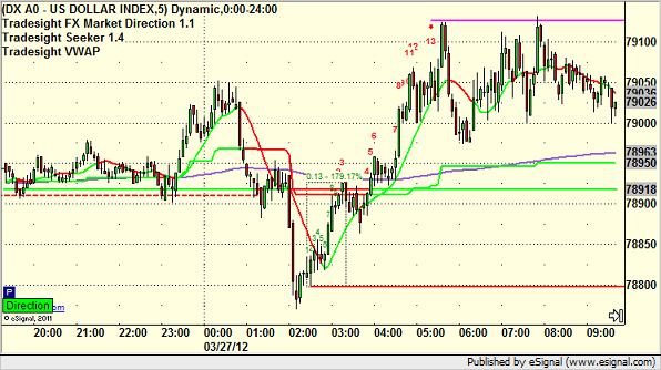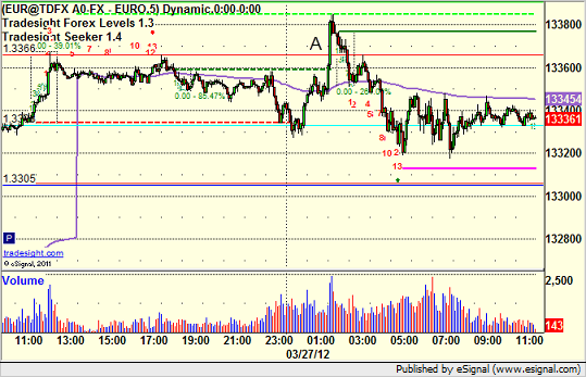 A very dull session and one stop out on the EURUSD. See that section below. New calls and Chat tonight. Here’s the US Dollar Index intraday with market directional lines: EURUSD: Triggered long at A and stopped. Dead night: PrevNext