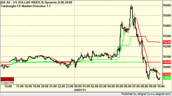 Half size ahead of NFP, and this was a good example of why. Both the long and short triggered and stopped. However, after NFP, back to full size and a nice winner to close the week and wrap the calls from March. Here’s the US Dollar Index intraday with our market direction tools: