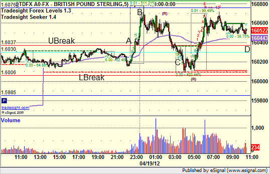 We came into the session long the second half of the trade from the prior day with a stop under LBreak. New trade triggered long at A, hit first target at B, and stopped the second half at C overnight, but never broke LBreak. We then adjusted the stop on the piece from the prior day under UBreak and continue to hold, which would be stopped under the line at D: