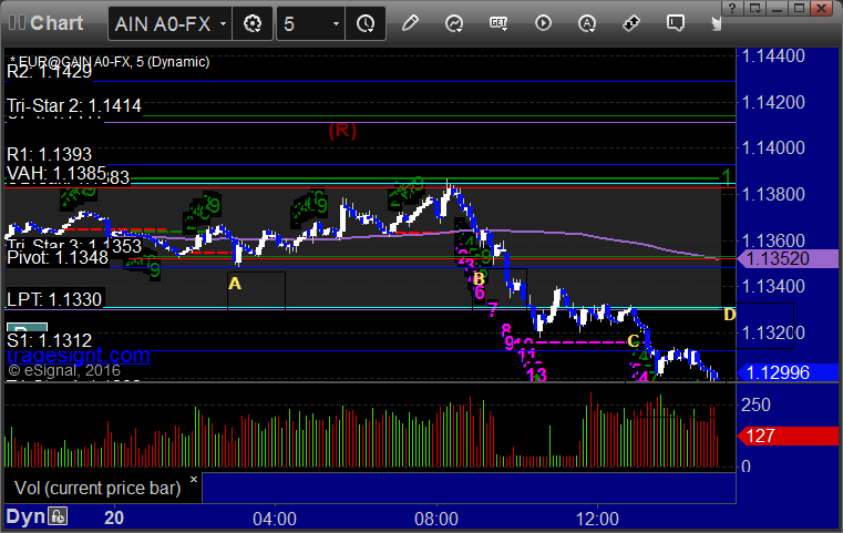 We added this trade in the morning after the EURUSD set the Pivot perfectly at A overnight, triggered at B, hit first target at C, still holding second half with a stop over levels at D: