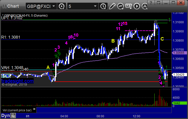 A winner for the session ahead of the Fed announcement. See GBPUSD section below. Here’s a look at the US Dollar Index intraday with our market directional lines: GBPUSD: Triggered long at A, hit first target at B, stopped second half at C: PrevNext