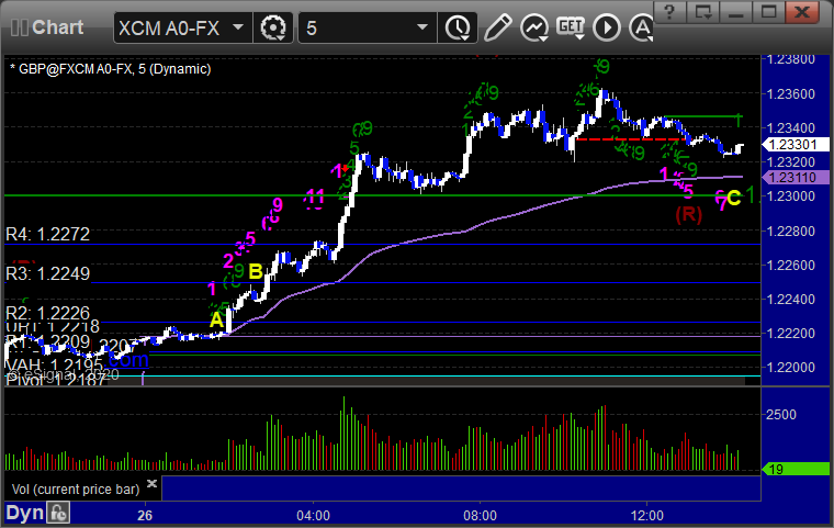 Triggered long at A, hit first target at B, still holding second half with a stop under C at 1.2300: