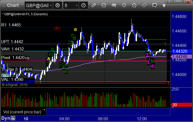 Triggered long at A, hit first target at B, still holding second half with a stop under Pivot:
