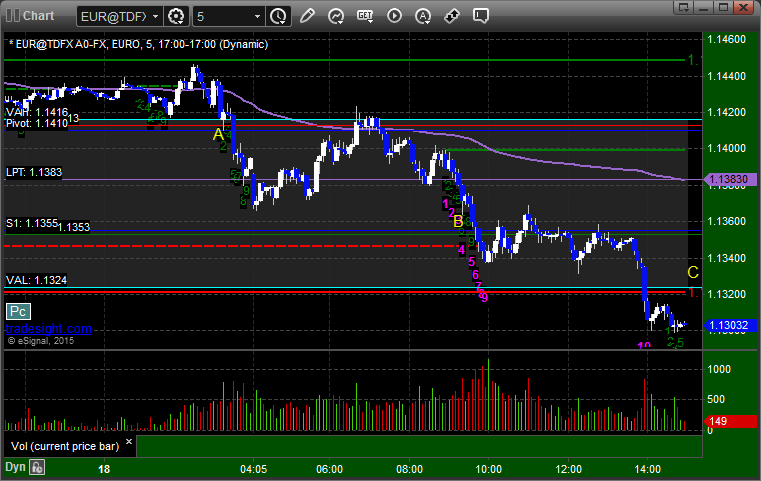 Triggered short at A, hit first target at B, still holding second half with a stop over VAL by 5 pips at C: