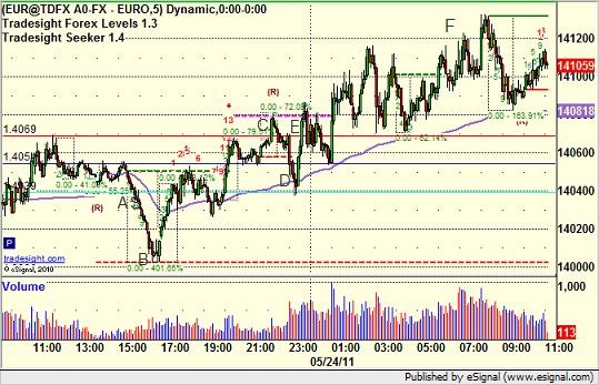 Triggered short early (half size) at A, came within a few pips of the target at B and then stopped. Triggered long early (half size) at C and stopped at D. Triggered long again for European session at E, hit first target at F, holding with a stop under UBreak: