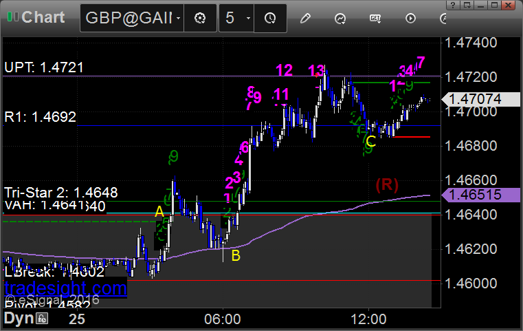 Came into the session long the second half of the prior day’s trade, which never stopped. New trade triggered long at A, barely stopped unfortunately at B, but the second half of the prior day’s trade continued, and I raised the stop on that twice and stopped out under R1 at C:
