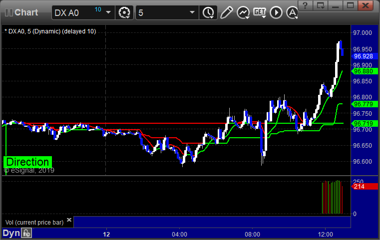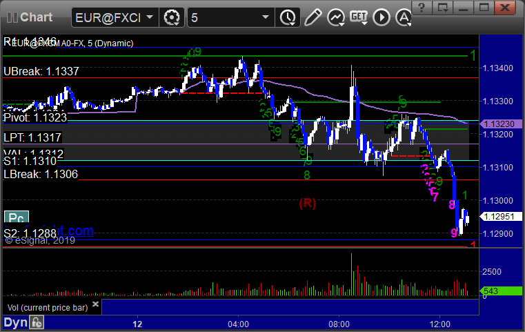 No calls because the Levels were all too close together due to the lack of range the prior day. Here’s a look at the US Dollar Index intraday with our market directional lines: EURUSD: PrevNext