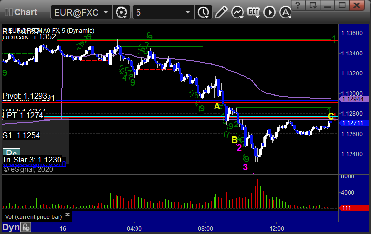 Triggered short at A, hit first target at B, still holding second half with a stop over LPT at C: