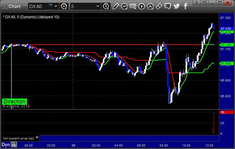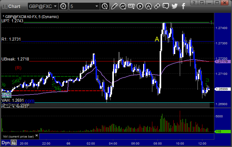 Finally, a trigger, but a loser, for the session. See GBPUSD section below. Here’s a look at the US Dollar Index intraday with our market directional lines: GBPUSD: Triggered long at A and stopped: PrevNext