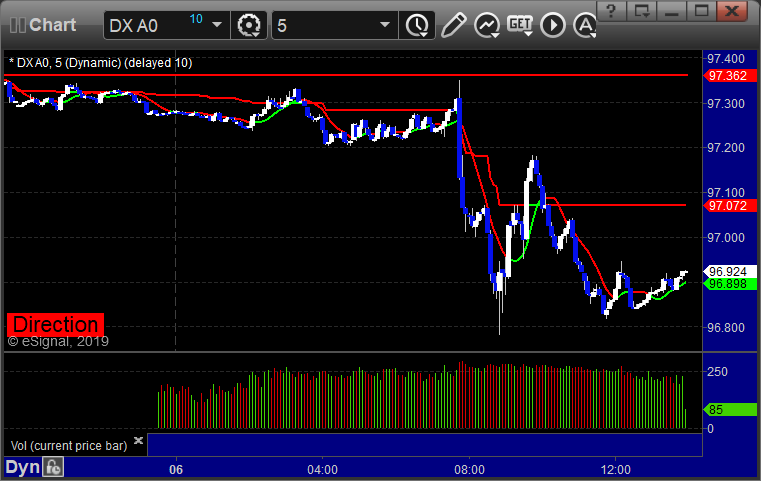 A small winner for the session. See EURUSD section below. Here’s a look at the US Dollar Index intraday with our market directional lines: EURUSD: Triggered long at A, hit first target at B, stopped second half under the entry: PrevNext