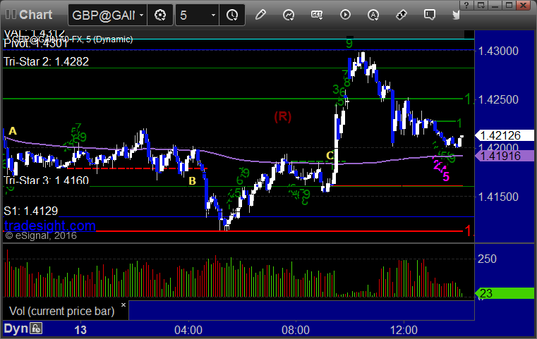The call triggered short under 1.4205 early to the left of A on the chart, but gave you a long time to take the trade. It hit first target at B, and stopped out of the second half in the morning at C: