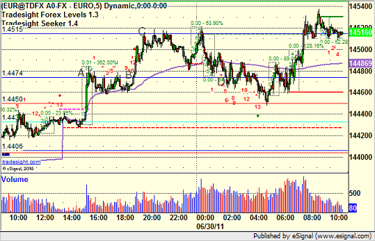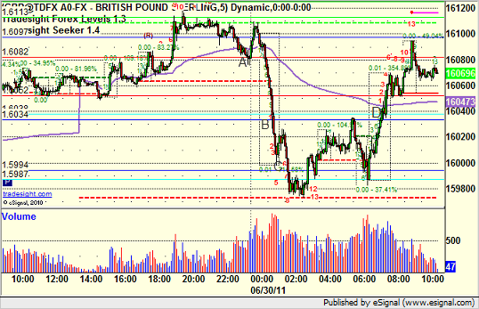 I added an additional call ahead of the European session short under red UBreak which swept at A and stopped unfortunately (worked later). Our other call triggered short at B, hit first target at C, and stopped final piece just over entry at D: