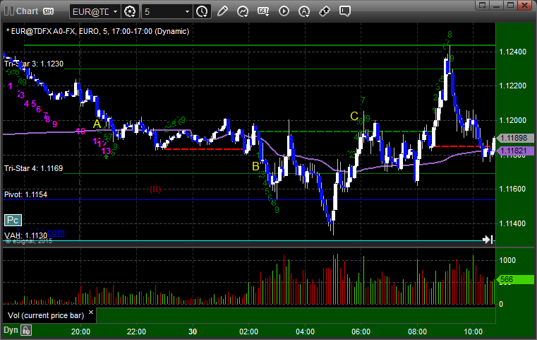 Triggered short at A, hit first target at B, stopped second half over entry at C: