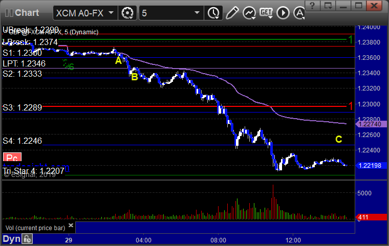 Triggered short at A and hit first target at B, then kept going and we are still short the second half with a stop over S4 at C: