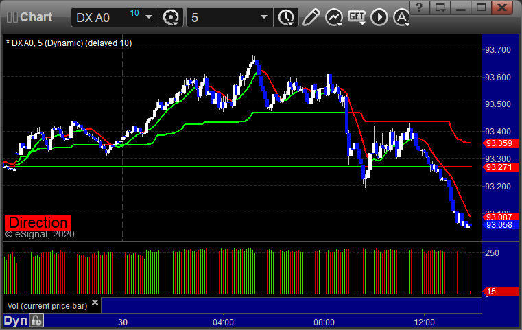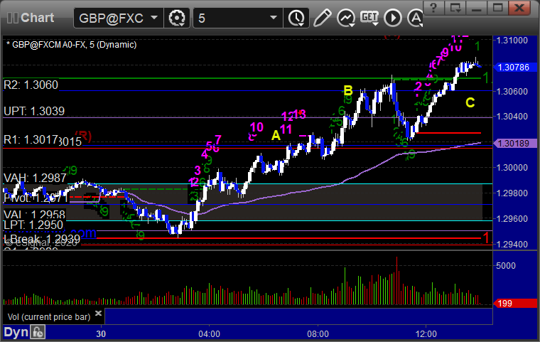 A winner (still going) for the session. See the GBPUSD section below. Here’s a look at the US Dollar Index intraday with our market directional lines: GBPUSD: Triggered long at A, hit first target at B, still holding second half with a stop under C: PrevNext