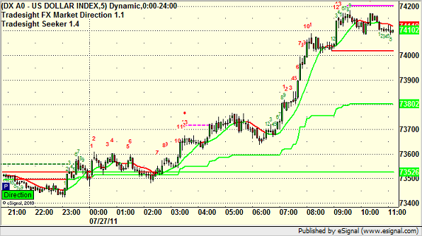 The Dollar gained strength overnight. See EURUSD below for trade reviews. Here’s the US Dollar Index intraday with our market directional lines: