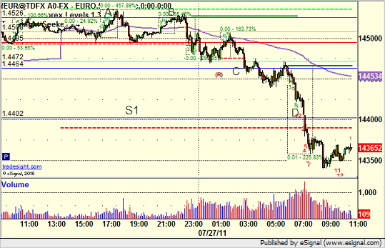 I’ve been half size with the situation in Washington unresolved. Triggered short very early (so 1/4 size) at A and stopped. Triggered short at B and stopped. Triggered short at C, hit first target at D, stop is over S1 and holding 100 pips in the money: