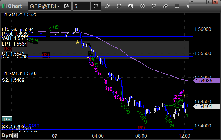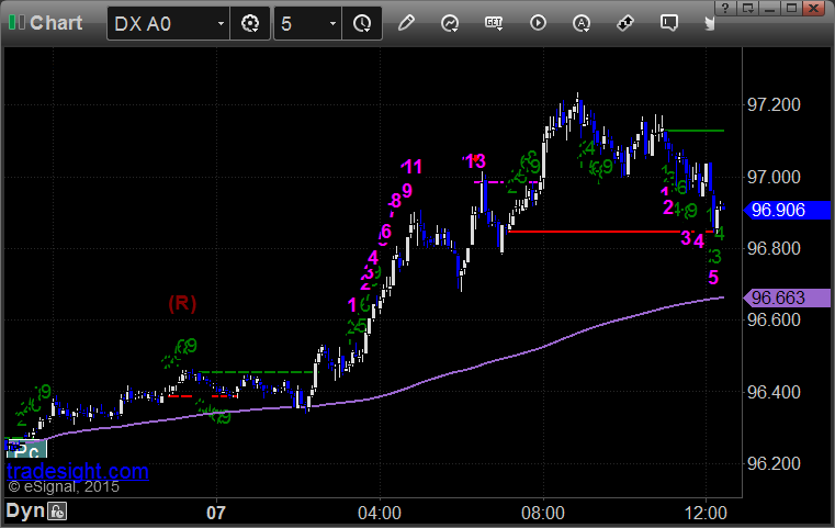 A nice winner that is still going. See GBPUSD section below. Here’s a look at the US Dollar Index intraday with our market directional lines: GBPUSD: Triggered short at A, hit first target at B, still holding second half with a stop over C: PrevNext