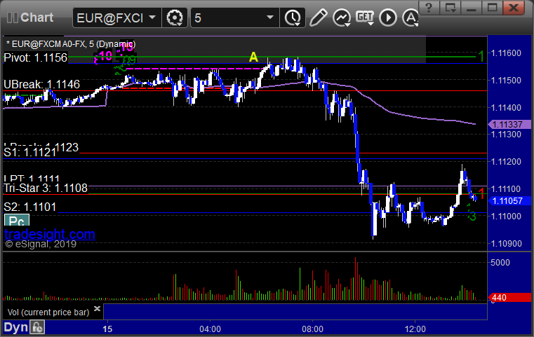 Should have put the call on the GBPUSD as that worked, but the EURUSD stopped. See that section below. Here’s a look at the US Dollar Index intraday with our market directional lines: EURUSD: Triggered long at A and stopped: PrevNext