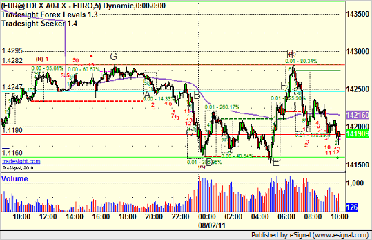 Lots to recap here. Triggered short under VAL at A per our call but gave you through B and the European open to enter. Hit first target at C, note the use of the green tri-star level precisely at D and E. Lowered stop in the morning and stopped at F both the second half of that trade and the trade from the prior session, which was a 100-pip winner to the final exit. Also, for fun, note the exact use of our UBreak red line at G and H, 12 hours apart: