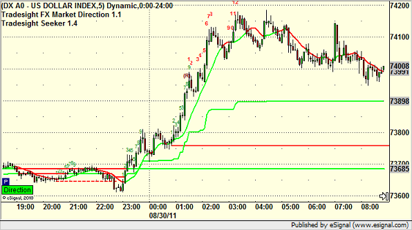 First, we stopped out of the second half of the trade from the prior session slightly in the money under the Pivot at A. Then we triggered short at B, hit first target at C, lowered the stop twice in the morning and stopped out at D for about 80 pips of gain: