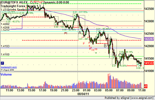 Pretty simple. Triggered short at A, hit first target at B, lowered stop twice and stopped at C for 100 pips: