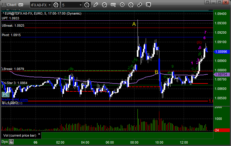 The short call triggered very early yesterday evening before some people might have even traded and eventually stopped. The long triggered at A on the Trade Balance news spike, which is why we use less size ahead of major news releases (frankly, if you are awake right ahead of the news, you should cancel the orders). We put them back in in the morning and the short triggered at B and stopped: