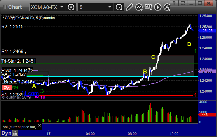 Triggered short at A and stopped. Triggered long at B, hit first target at C, kept going and still holding second half with a stop under 1.2490 at D: