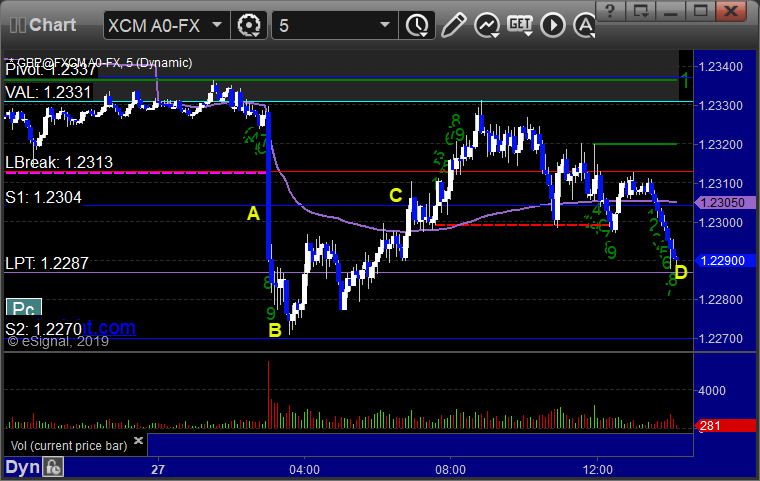 Triggered short at A, hit first target at B, stopped at C. Second half of Wednesday’s trade closed at D: