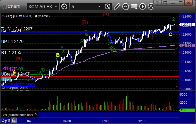 Triggered long at A, hit first target at B, still holding second half with a stop under R2 at C: