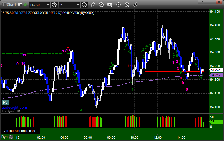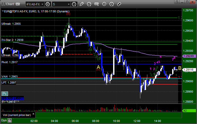 Not much for the triggers despite four calls. See EURUSD section below. Here’s a look at the US Dollar Index intraday with our market directional lines: EURUSD: Triggered short at A, did nothing, closed at B: PrevNext
