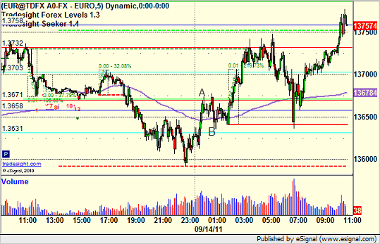 I added calls in the EURUSD ahead of the European session because the GBPUSD short triggered early. Here, we triggered long at A and stopped at B: