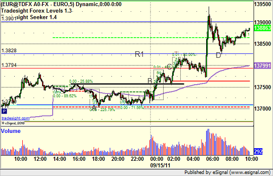 Early trigger (so quarter size since it was a half size night for CPI) at A that barely triggered and stopped. Didn’t trigger again (never even went 2 pips under the entry Level on the bid though it bounced along it nicely). Triggered long at B, hit first target at C, raised stop in morning twice, currently holding with stop under R1, which it bounced off of at D: