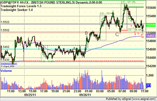 Triggered long new calls at A, hit first target at B, raised stop and stopped (just barely) at C:
