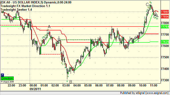 Interesting session with lots of Seeker signals of use. I’m going to write up the US Dollar Index separately and post to the Blog tonight for discussion, but here it is with market direction lines and the Seeker: