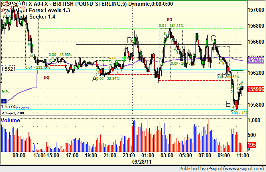 Triggered short early at A (just barely, half size) and stopped. Triggered long at B and stopped. Put them both back in the morning and long triggered at C and stopped, but the better trade was the short as I said last night. That triggered at D, went EXACTLY to the VAL target at E (and bottomed out on a Seeker 9-bar setup) and still holding the second half: