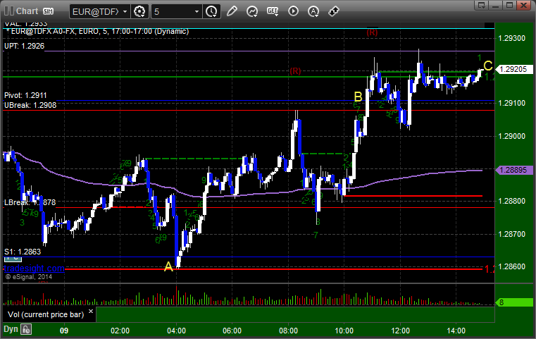 Came into the session still short the second half of the prior day’s play (and in the money). If you follow our order staggering rules, 2 out of 3 pieces of the EURUSD short triggered at A and stopped. The long triggered at B (and stopped us out of the second half of the prior day’s trade), and didn’t go far, so I closed at C: