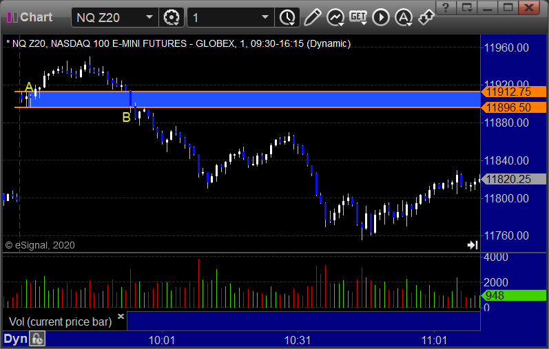 NQ Opening Range Play triggered long at A and worked but too far out of range (just by a tick or 2, you really should have taken it, but we didn’t count it), triggered, short at B but too far out of range: