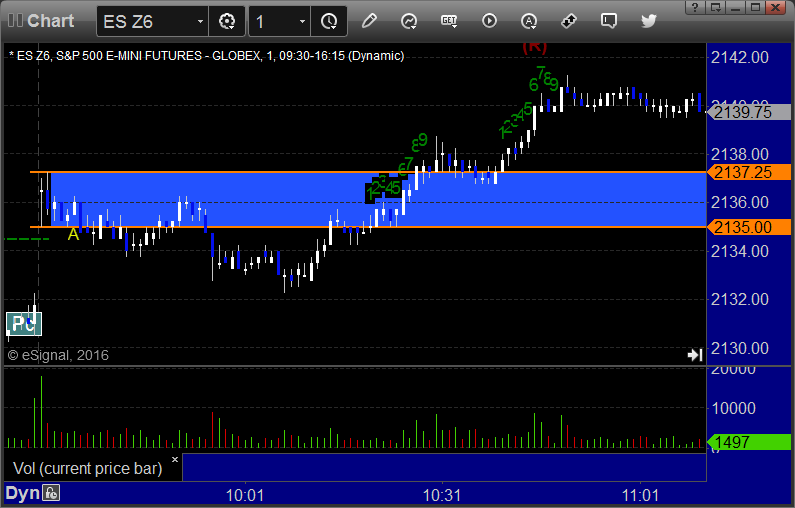 ES Opening Range Play triggered short at A and ultimately would have worked just enough for a partial, but I posted to close at a 1 tick loss after we saw how bad volume was: