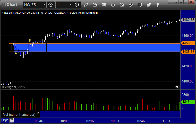 NQ Opening Range Play triggered short at A and worked enough for a partial, triggered long at B and worked: