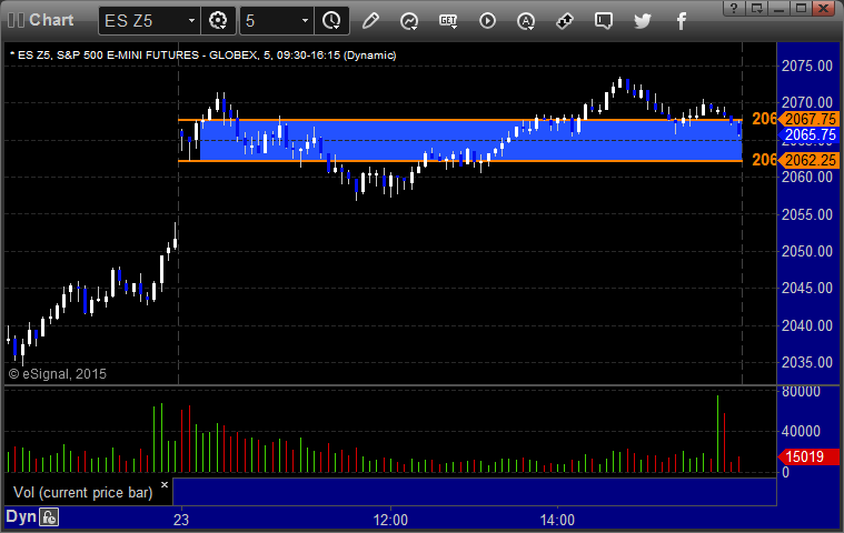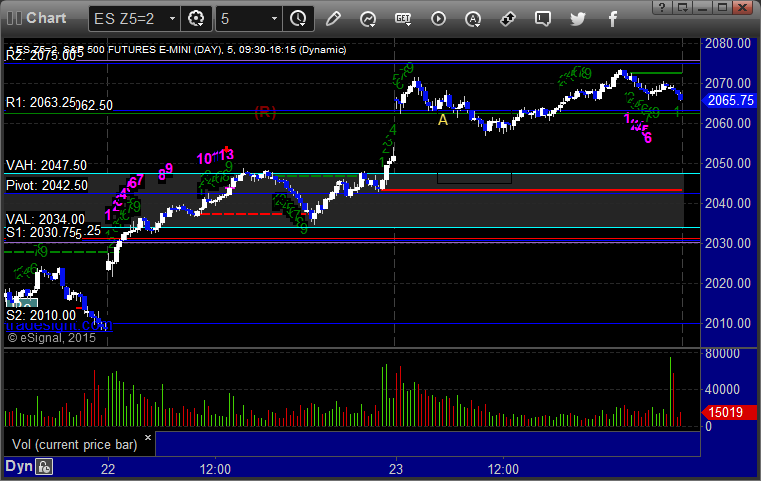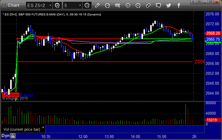 Triggered short at A at 2062.00 and stopped on a sweep. Put it back in, triggered 15 minutes later, hit first target for 6 ticks, stopped second half at 2060.00: