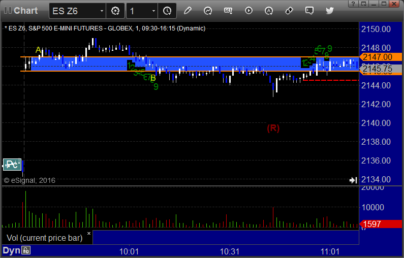 ES Opening Range Play triggered long at A and stopped (missed the 8 tick partial by 1 tick), triggered short at B and worked eventually for a partial: