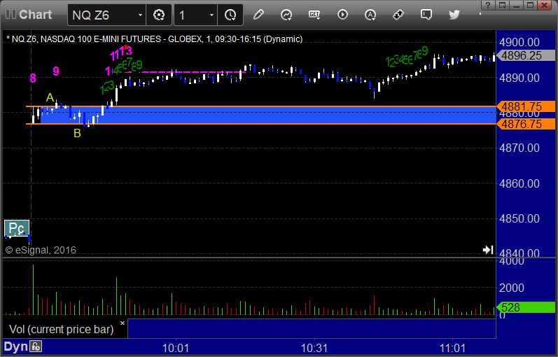 NQ Opening Range Play triggered long at A and stopped, triggered short at B and stopped (valid because it was into the gap):