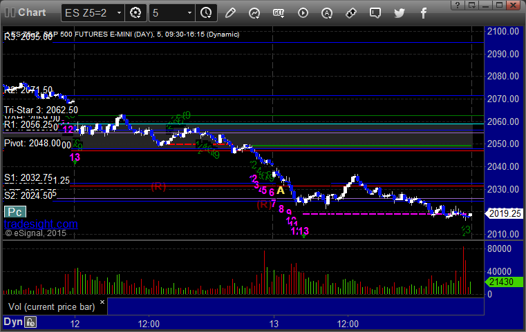 Triggered short at 2031.00, hit first target for 6 ticks, lowered stop a few times and stopped the second half at 2026.25 for 19 ticks: