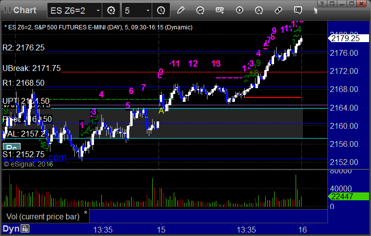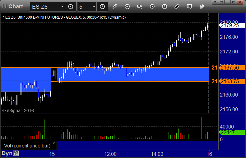 My call triggered short at A at 2163.50 and stopped for 7 ticks. This call basically lined up with the OR play, so whether you took this in addition or just took the OR play is your call: